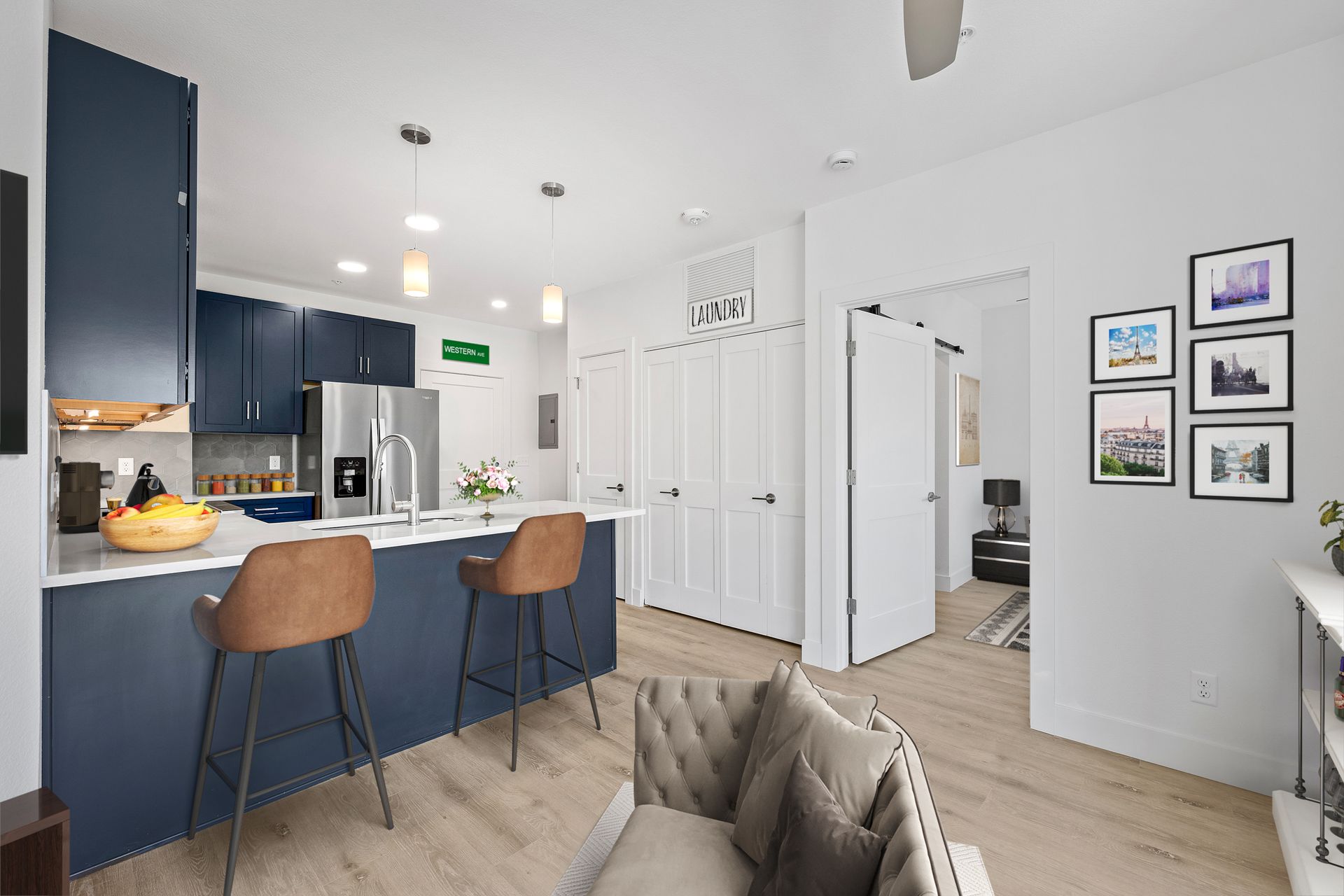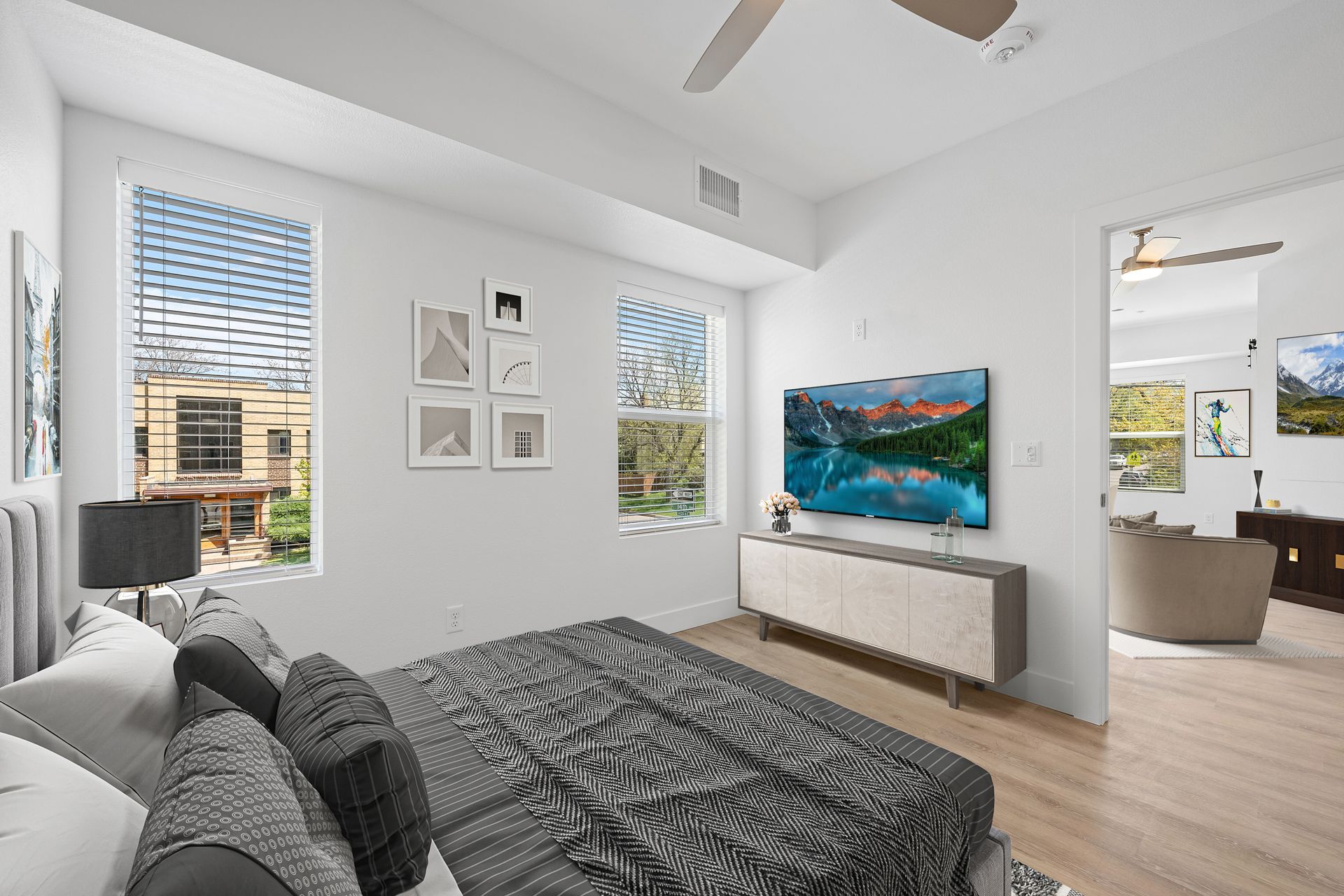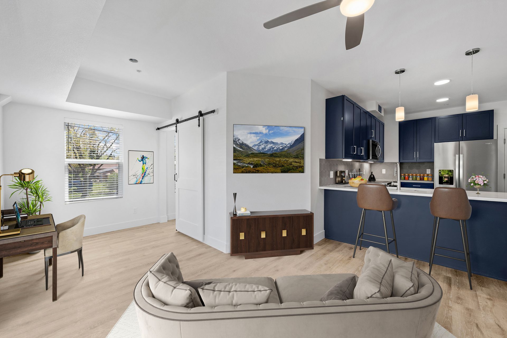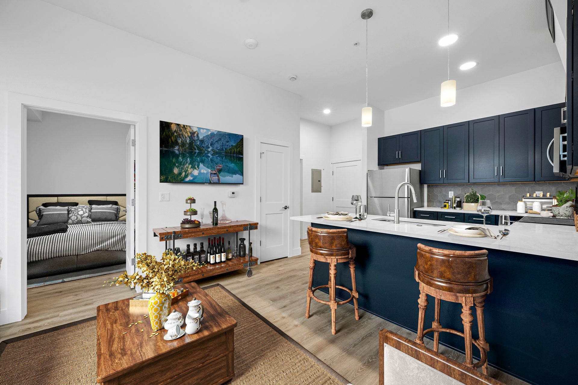 We've thoughtfully curated every inch of our apartments to ensure you get not only the best in style but the best of ease as well. With features like quartz countertops, private balconies, and tile surround showers, you'll discover that relaxation and vitality come hand in hand at Poplar Place Apartments. Community amenities include controlled entry, modern exercise facility and an amazing Rooftop Deck with views of the mountains and Downtown Skyline that rival the best in the City. An ideal location where every detail is crafted to enhance your living experience.